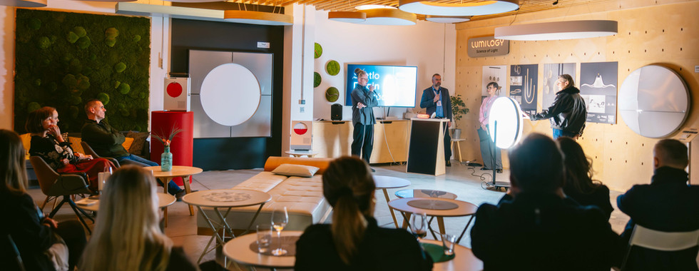 Hostiteľ večera a zakladateľ značky LUMILOGY, Róbert Naništa, hneď v úvode pripomenul kľúčovú myšlienku: „Technológia nie je cieľ, ale prostriedok.“ Či už ide o inteligentné riadenie Casambi alebo špičkové difúzne vlastnosti materiálov Barrisol, všetko musí slúžiť jedinému cieľu – komfortu človeka. A práve túto filozofiu sme pretavili aj do nových kolekcií svietidiel.