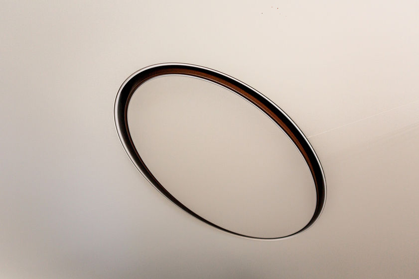 Moderné elipsové svietidlo LUMILOGY zavesené kolmo na lankách, s doplnkom nepriameho večerného svetla, dreveným dekórom a smart ovládaním Casambi. Skladom vo výpredaji. Vyrobené na Slovensku z prémiovej membrány Barrisol.