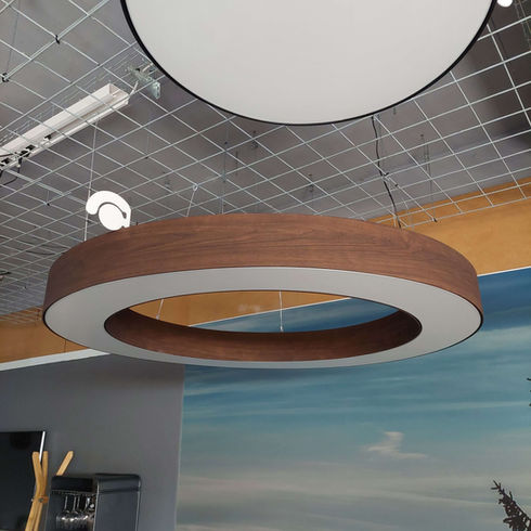 Moderné prstencové svietidlo LUMILOGY zavesené kolmo na lankách, s doplnkom nepriameho večerného svetla a RGB farieb v priamom svetle, dreveným dekórom a smart ovládaním Casambi. Skladom vo výpredaji. Vyrobené na Slovensku z prémiovej membrány Barrisol.